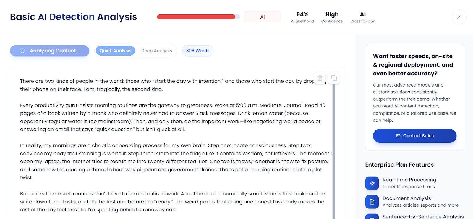 The platform helps multimodal detection throughout textual content, pictures, video, and audio, with credit-based utilization (e.g., per-word for textual content, per-image for pictures).