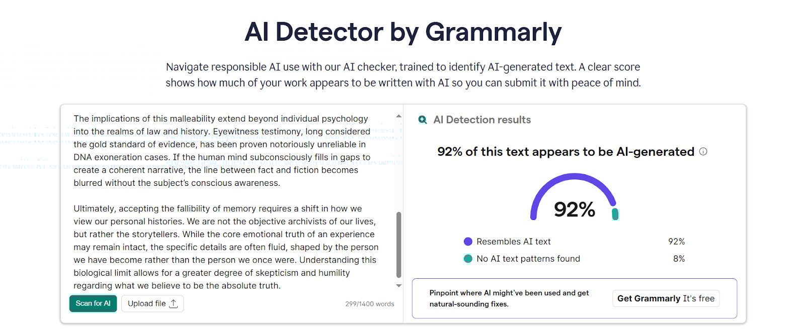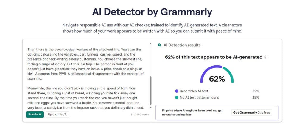 On AI textual content detection, Sapling technically wins — it posted a clear 100% rating, whereas TruthScan landed at 94.38%, and Grammarly trailed at 72.38%.